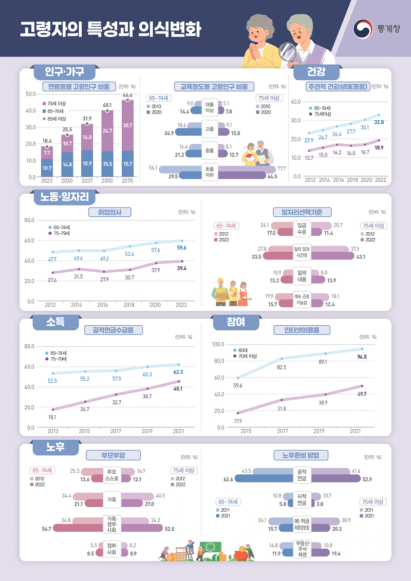 이번 포스팅에서는 65세 이상 고령자를 65~74세, 75세 이상으로 세분하여 분석한 '고령자의 특성과 의식변화 통계' 정보 알려드리겠습니다. 통계청은 약 7백만명으로 추산되는 베이비붐 세대(1955년~1963년)가 빠르게 고령화되어 감에 따라, 이에 대응하기 위해 65세 이상 고령자를 65~74세, 75세 이상으로 세분하여 지난 10년간의 고령자 특성과 의식변화를 분석하였는데요. 통계청에서 발표한 자료를 인용하여 65세 이상 고령자의 인구·가구, 건강, 노동·일자리, 소득, 참여, 노후 부문별로 그 특성과 의식변화를 살펴보도록 하겠습니다. Ⅰ. 인구·가구 1. 인구 추이 2037년을 기점으로 75에 이상 고령인구가 65~74세 인구보다 많아지고, 2070년에는 OECD 주요국 중 75세 이상 인구 비중..